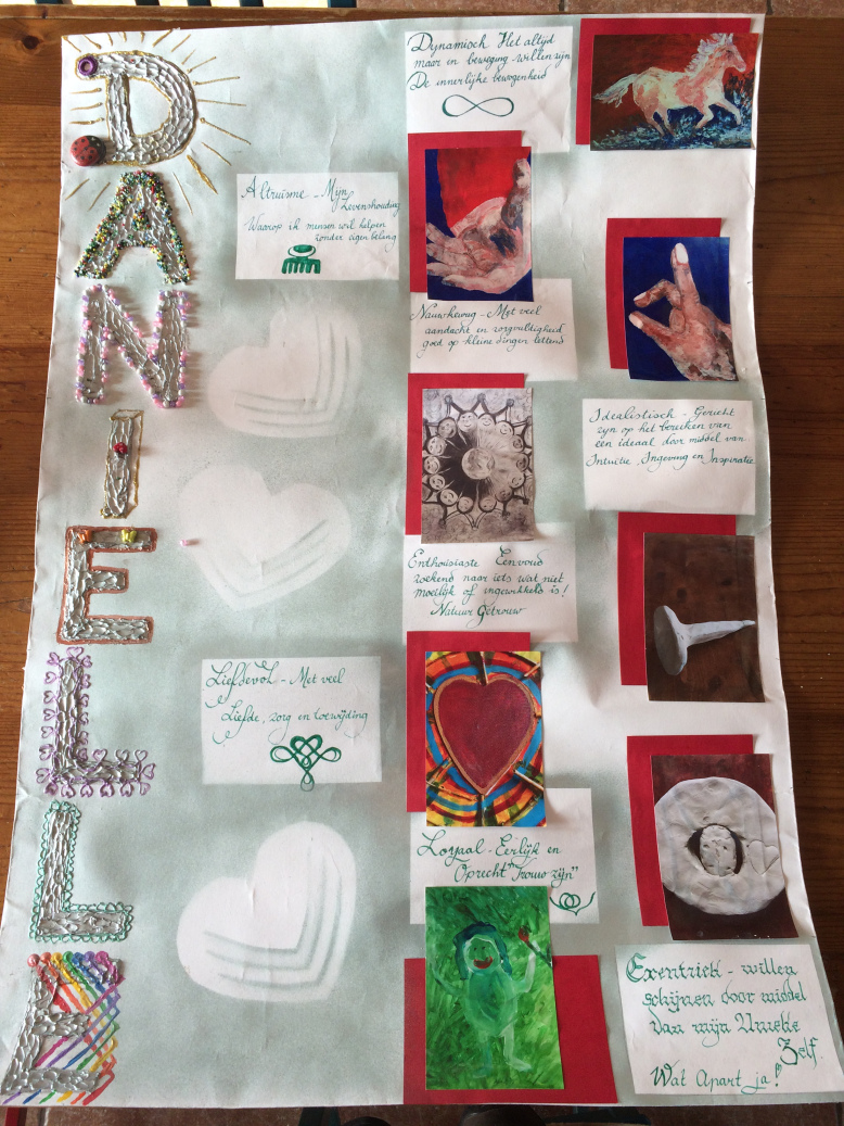 Kunstzinnige opdracht “het naamgedicht” Maak van elke letter van je naam een zin of woord wat bij jou past. Ik heb er zelf beeld bij gezocht, omdat ik een beelddenker ben.